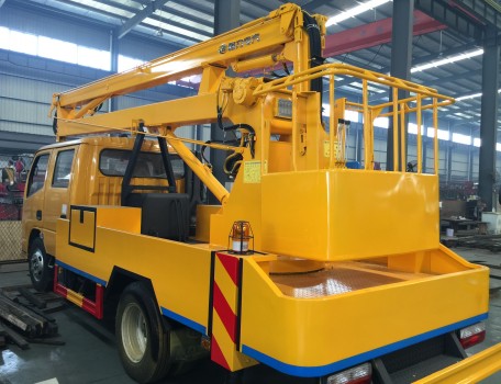 2、上裝配置:采用三節(jié)折臂,帶高空作業(yè)工作斗,載重量200kg。隨車安裝手動控制操作系統(tǒng),上下可操作,工作斗中帶操縱裝置,360度全方位旋轉,安裝手油門,可在工作斗中操控升降、旋轉。采用國產名牌液壓油缸及進口換向閥,換向平衡,操作靈活方便,支腿與工作臂互鎖,防止誤操作過位。作業(yè)高度14米,安裝四個液壓伸出式支腿,保證整車在操作時的穩(wěn)定性與安全性,第一節(jié)臂帶前吊鉤,吊鉤可起重1噸貨物。