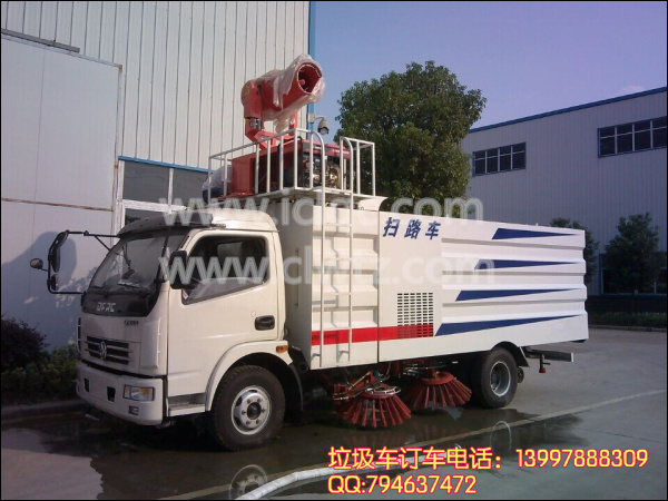 再次:多功能洗掃車充分利用車輛水箱大和自帶高壓水泵的優(yōu)勢,加裝抑塵霧泡和動力機組,使用擁有抑塵噴霧降塵的能力,相當于一臺專用抑塵車,也稱噴灑霧炮車。