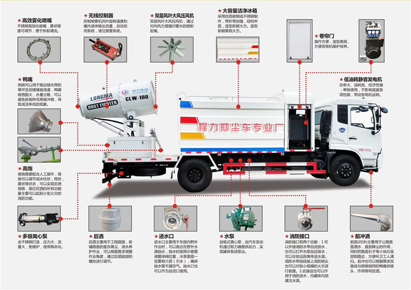 抑塵灑水車的噴霧機水平噴射距離從25米到120米不等,用戶可以根據(jù)自己的需求來選擇不同的噴霧機。